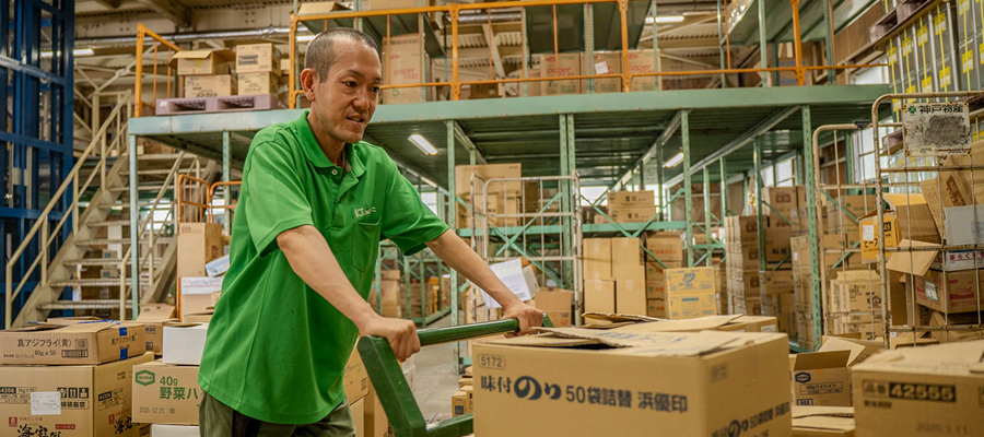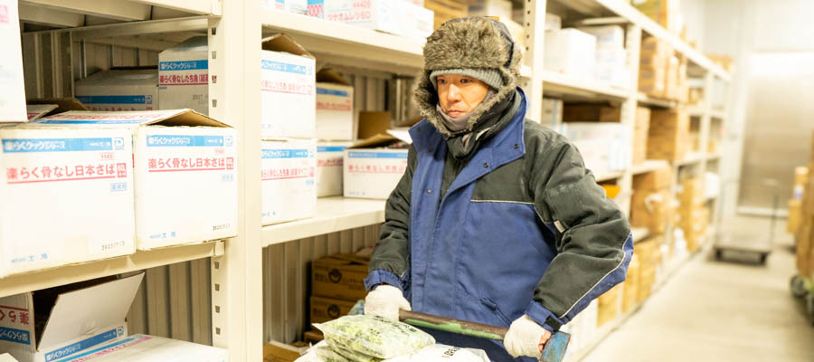 商品の荷受けから始まり、各棚への片付けやフォークリフトを使った積み込み、倉庫内の整理整頓などが日々の基本的な業務です。お客様にお届けする乾物や冷凍食品の荷出し作業や、仕分け作業も担当しています。